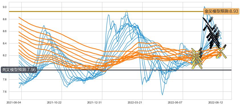 ➢ 45小时均线于(2022-08-01: 8.42)形成【死叉】基于【死叉历史模型】预测死叉后最低波谷价格: 7.84, 死叉后最低价格8.08,尚未达到预测最低波谷价格, 预期继续下跌