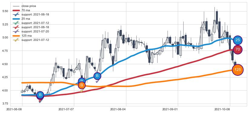 ➣ 70小时均线于(2022-05-24: 4.02)形成【金叉】基于【金叉历史模型】预测金叉后最高波峰价格: 5.25, 金叉后最高价格5.81,已经上涨超出预测最高波峰价格, 预期回调