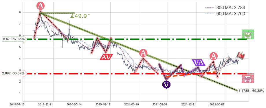 ♘ 阻力价格位5.67,可信任强度94.01%,距离最后交易2022-08-12形成的收盘价格3.850相差 +47.38%
