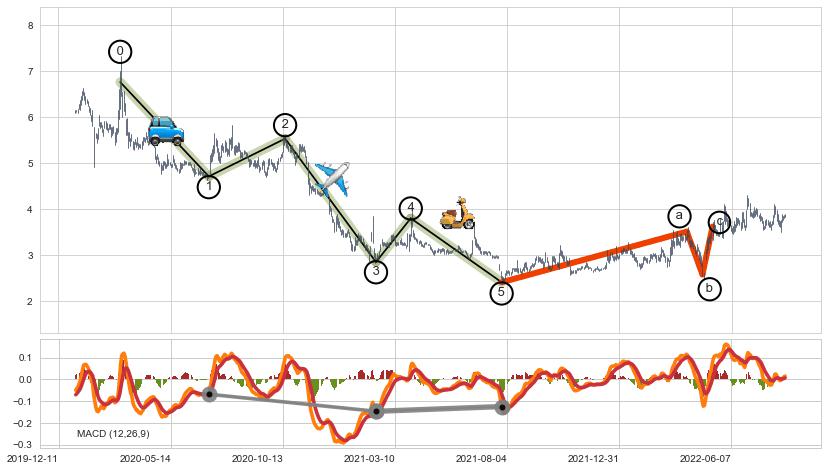 ➣ 波浪理论:猜想达到c点后小反弹终止反转下跌 → 下跌 → 【拐点】临近 → 阶段均值回复结束后继续大周期趋势跟踪