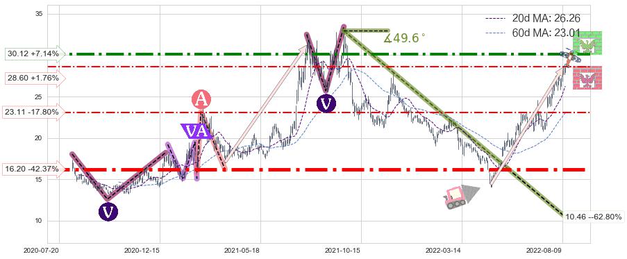 ♘ 阻力价格位30.12,可信任强度71.72%,距离最后交易2022-08-12形成的收盘价格28.11相差 +7.14%