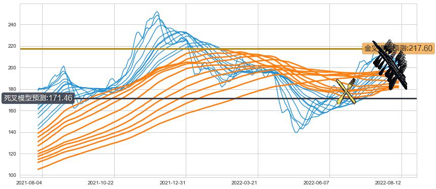 ➢ 60小时均线于(2022-08-11: 192.10)形成【死叉】基于【死叉历史模型】预测死叉后最低波谷价格: 164.40, 死叉后最低价格189.58,尚未达到预测最低波谷价格, 预期继续下跌