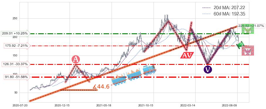 ♘ 阻力价格位209.01,可信任强度58.54%,距离最后交易2022-08-12形成的收盘价格189.58相差 +10.25%