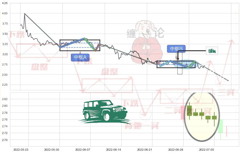 ➢ 【中枢B】:2022-05-24-2022-07-27,中枢由6笔构成,共46交易日, ZG=2.810, ZD=2.740
