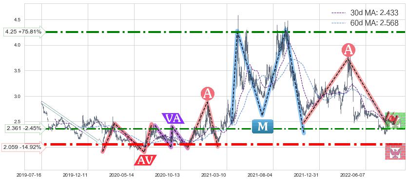 ♘ 阻力价格位2.361,可信任强度60.44%,距离最后交易2022-08-12形成的收盘价格2.420相差 -2.45%