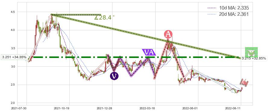 ♘ 阻力价格位3.251,可信任强度91.57%,距离最后交易2022-08-12形成的收盘价格2.420相差 +34.35%