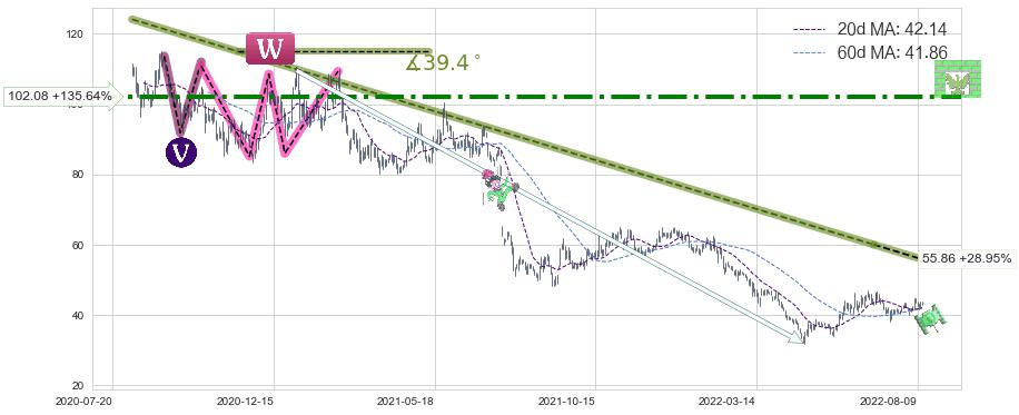 ♘ 阻力价格位102.08,可信任强度83.91%,距离最后交易2022-08-12形成的收盘价格43.32相差 +135.64%
