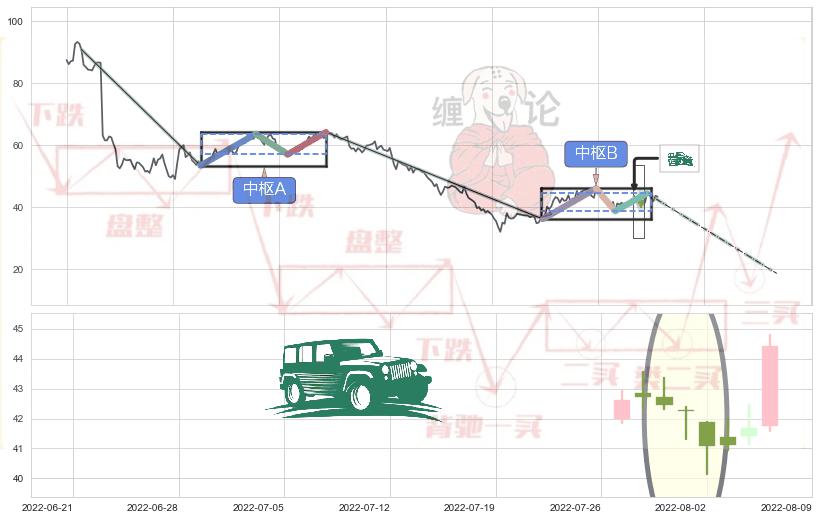 ➣ 【中枢B】:2022-05-27-2022-08-05,中枢由4笔构成,共50交易日, ZG=44.43, ZD=38.71