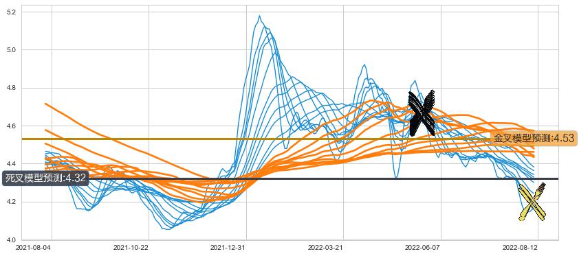 ➣ 34小时均线于(2022-05-23: 4.69)形成【死叉】基于【死叉历史模型】预测死叉后最低波谷价格: 4.42, 死叉后最低价格4.11,已经下跌超出预测最低波谷价格, 预期反弹