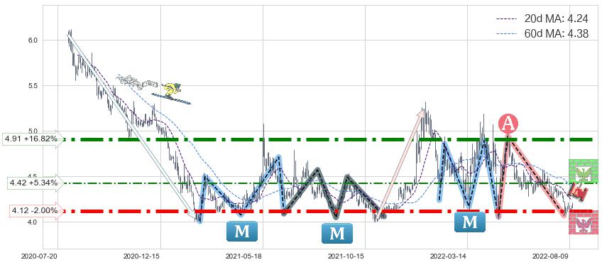 ♘ 阻力价格位4.42,可信任强度42.67%,距离最后交易2022-08-12形成的收盘价格4.20相差 +5.34%