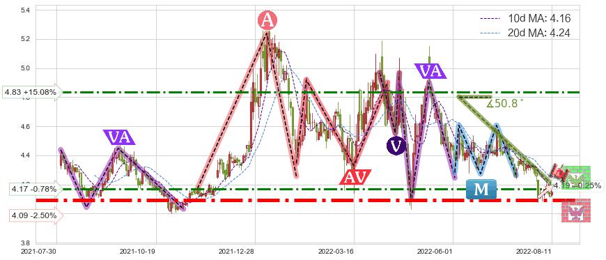 ♘ 阻力价格位4.17,可信任强度56.96%,距离最后交易2022-08-12形成的收盘价格4.20相差 -0.78%