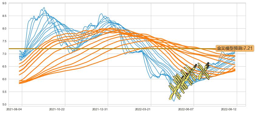 ➣ 70小时均线于(2022-05-30: 6.19)形成【金叉】基于【金叉历史模型】预测金叉后最高波峰价格: 7.37, 金叉后最高价格7.21,尚未达到预测最高波峰价格, 预期继续上涨