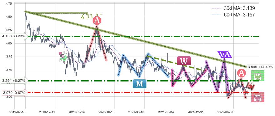 ♘ 在最后的下跌阶段2019-07-16至2022-07-12,存在 持续未破位的阻力位 ,阻力价格3.549,可信任强度87.66%,其距离最后价格3.100相差 +14.49%
