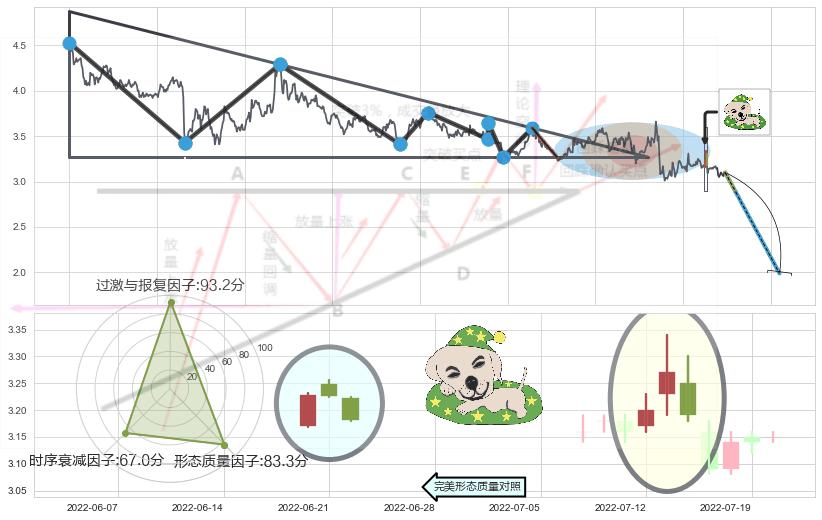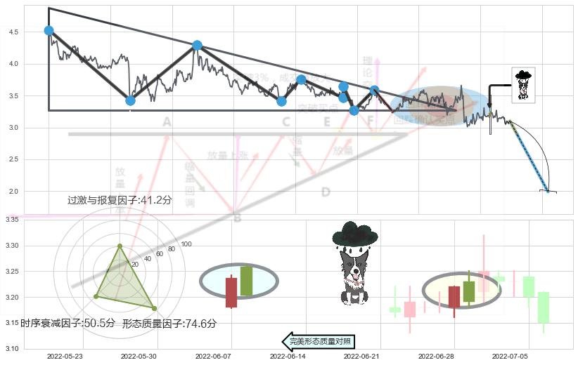 从2019-07-16至2022-07-12,共包含726个交易日,阶段股价下跌-28.20%,阶段股价变动位移路程比: 1 : 23,下跌趋势角度: 33.4,2020-02-03向↘︎形成缺口,跳空下跌-9.92%˚