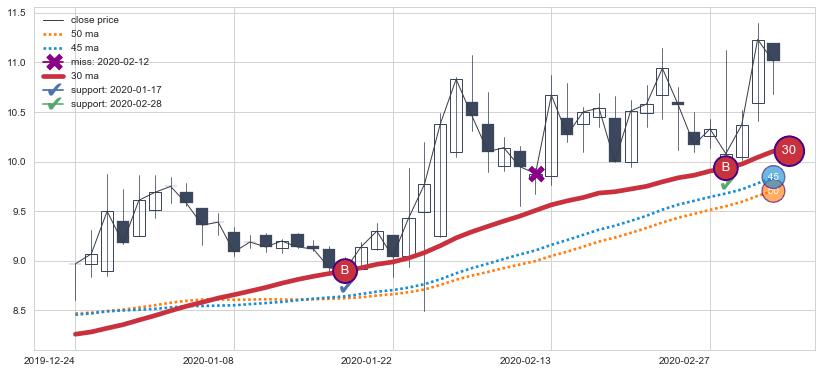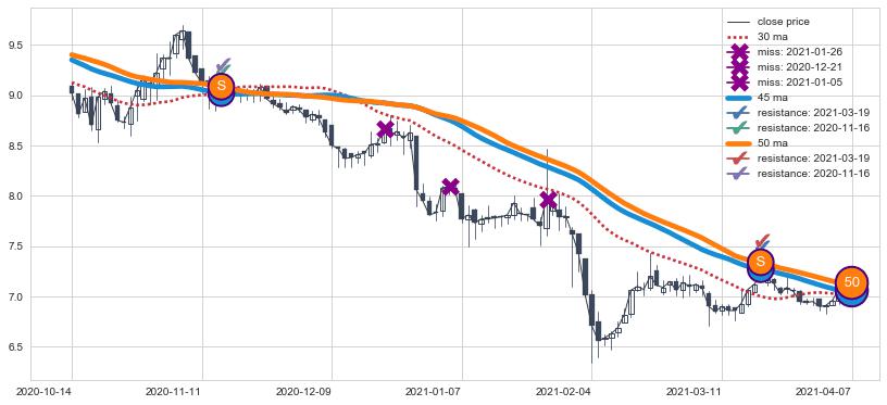 ➢ 最优均线组合共正确确认支撑阻力信号4处,正确确认率 50.00%