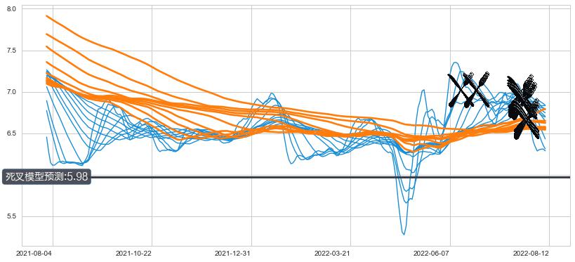 ➣ 40小时均线于(2022-07-26: 6.99)形成【死叉】基于【死叉历史模型】预测死叉后最低波谷价格: 6.45, 死叉后最低价格6.17,已经下跌超出预测最低波谷价格, 预期反弹
