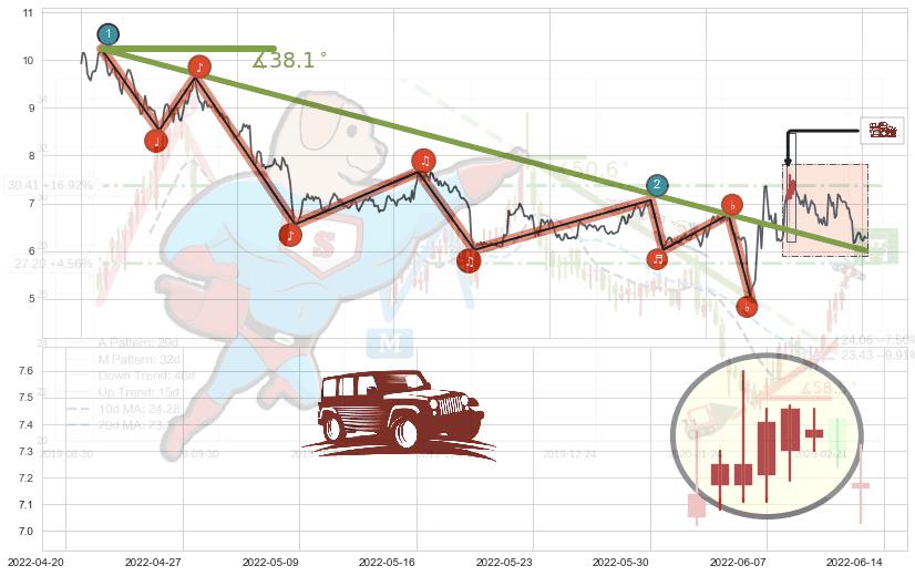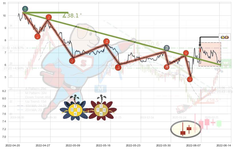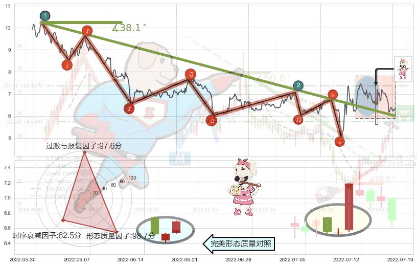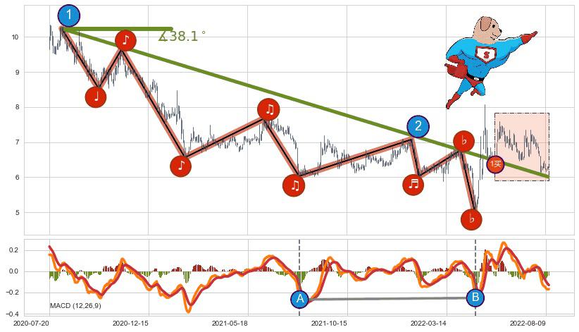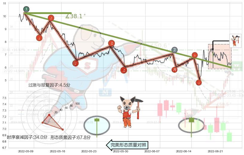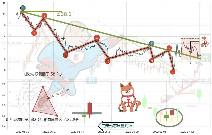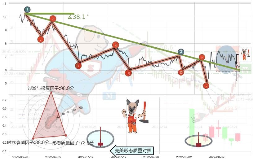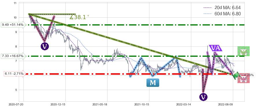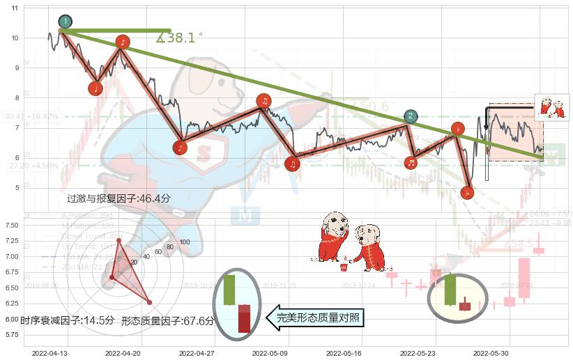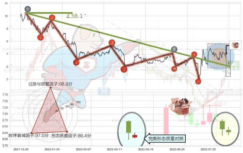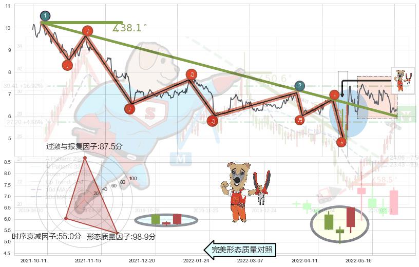 ➣ 2020-08-06-2022-05-12下跌趋势存在反转上涨[机会],虽然原下跌趋势的阻力位(6.01)已被突破,但其阻力效果尚存,原下跌趋势角度: 38.1˚