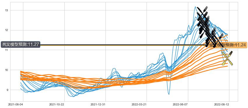 ➣ 70小时均线于(2022-07-14: 11.49)形成【死叉】基于【死叉历史模型】预测死叉后最低波谷价格: 10.88, 死叉后最低价格10.25,已经下跌超出预测最低波谷价格, 预期反弹
