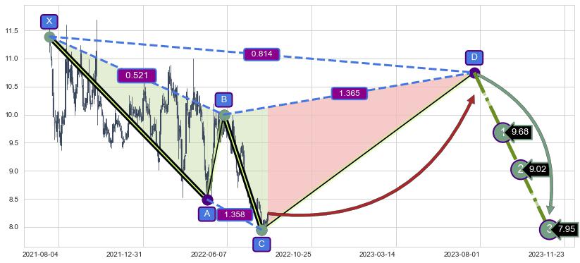 ➣ D点拟合预测价格10.75,距离最后交易收盘价格8.24相差 +30.44%