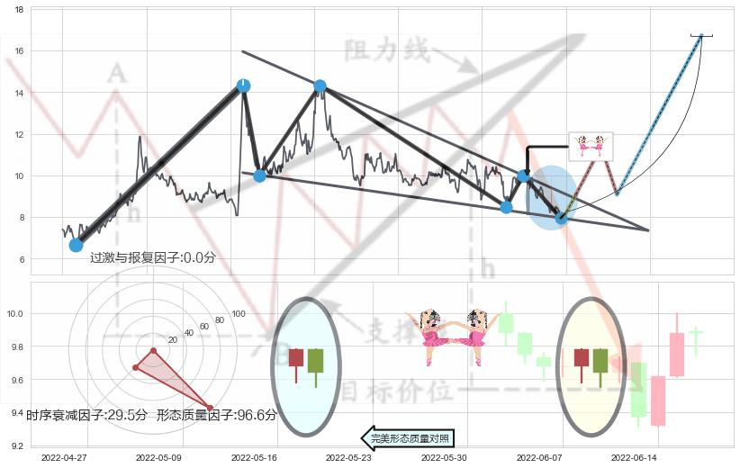 ➣ 锤头线(锤子线) + 降楔型临近阻力猜想转换支撑上涨信号叠加后【目标达成率】中等,【看多】信号叠加【存续影响中等】