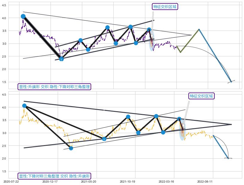 ➢ 下降对称三角整理:下行突破支撑位破位, 猜想持续下沉下跌,被突破的支撑位已变为阻力位
