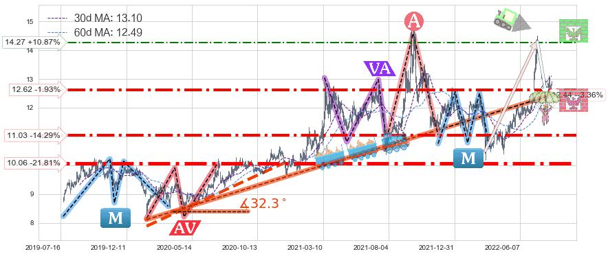 ♘ 阻力价格位14.27,可信任强度54.37%,距离最后交易2022-08-12形成的收盘价格12.87相差 +10.87%