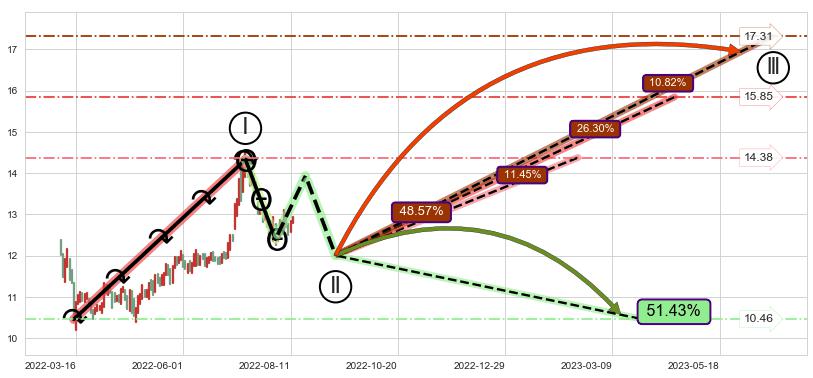 ➢ 循环浪继续向上【最低】位置(2023-02-15, 14.38),匹配聚类样本比例23.58%, 可能性概率11.45%