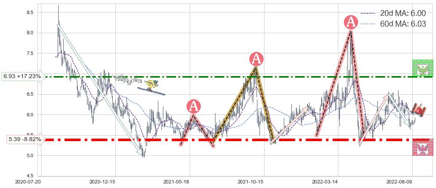 ♘ 阻力价格位6.93,可信任强度68.54%,距离最后交易2022-08-12形成的收盘价格5.91相差 +17.23%