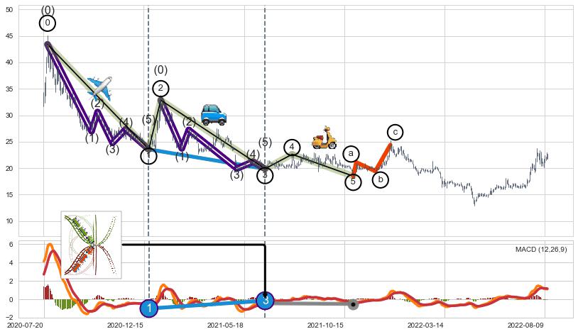 ➣ 第一, 三, 五浪下跌动能逐渐【衰弱变小】,趋势呈现不稳迹象