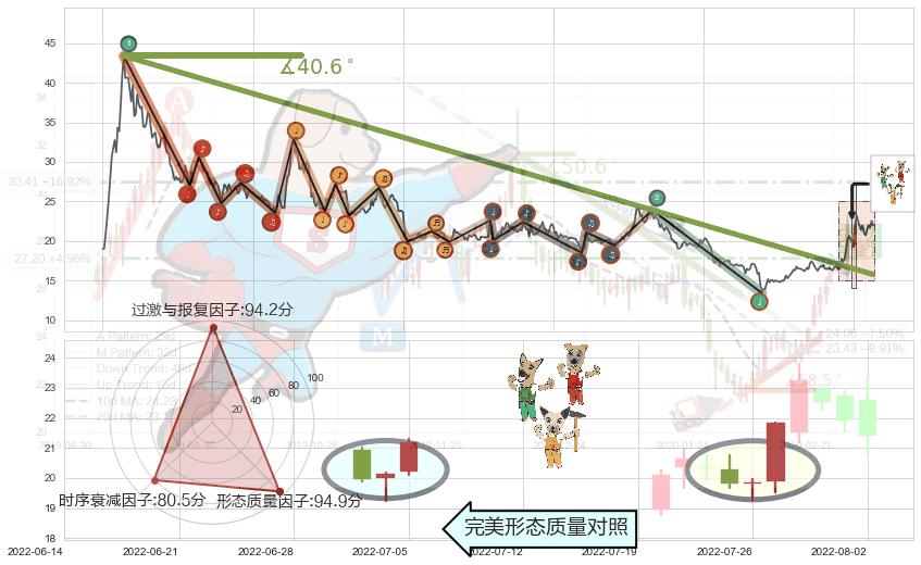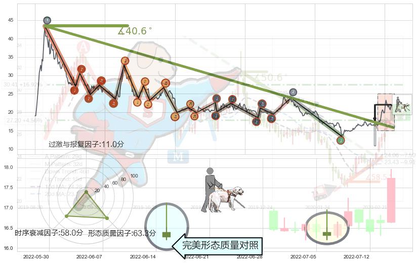 ➢ 2020-07-24-2022-06-15下跌趋势存在反转上涨[机会],其原下跌趋势的阻力位(15.77)已被突破[强支撑信号],原下跌趋势角度: 40.6˚