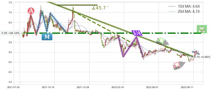 ➢ 【多方力量耗尽,空方打破攻守平衡点】下降三角形中继整理, 已在2022-07-15突破【支撑】颈线 4.85 →演变成下降通道