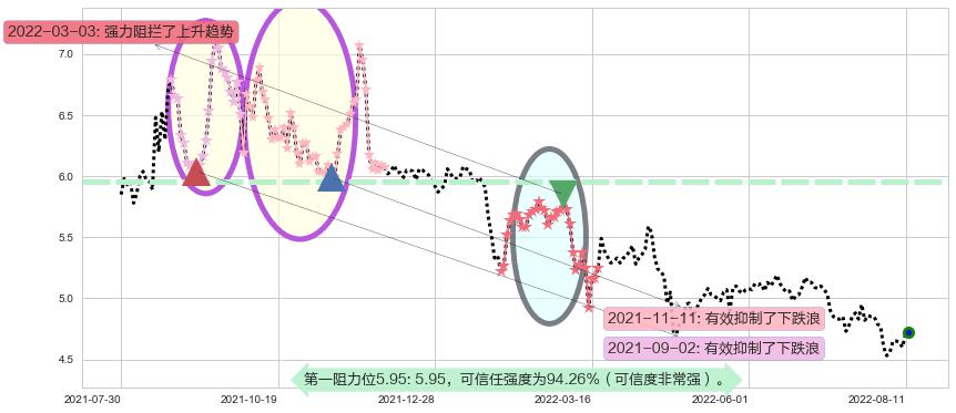 ♘ 阻力价格位5.95,可信任强度94.26%,距离最后交易2022-08-12形成的收盘价格4.72相差 +26.12%