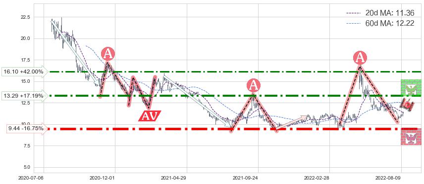♘ 阻力价格位16.10,可信任强度55.00%,距离最后交易2022-08-12形成的收盘价格11.34相差 +42.00%