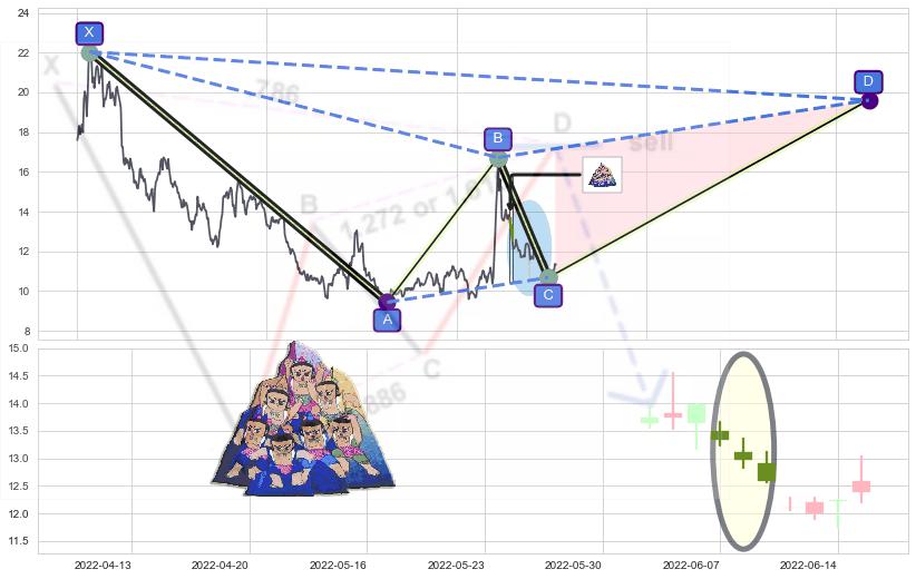 ➢ 谐波伽利:b下跌接近c:猜想支撑性拉升 → 上涨 →【拐点】支撑临近 → 大趋势均值回复