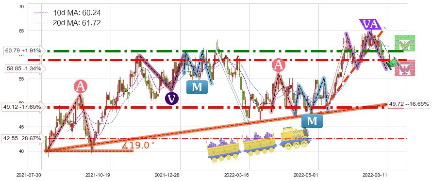 ♘ 阻力价格位60.79,可信任强度87.73%,距离最后交易2022-08-12形成的收盘价格59.65相差 +1.91%