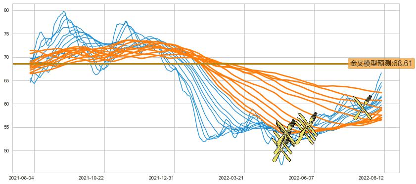 ➢ 60小时均线于(2022-05-06: 53.72)形成【金叉】基于【金叉历史模型】预测金叉后最高波峰价格: 69.28, 金叉后最高价格67.87,虽然还未上涨超出预测最高波峰价格,但横盘时间过长, 预期回调