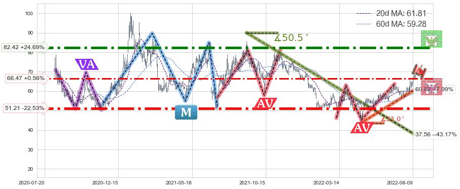 ♘ 支撑价格位51.21,可信任强度94.53%,距离最后交易2022-08-12形成的收盘价格66.10相差 -22.53%