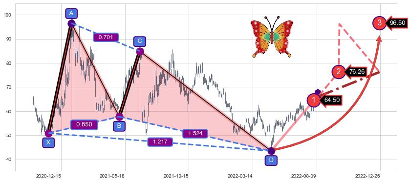 ➢ 谐波蝴蝶:c下跌到达d:猜想拉升 → 上涨 →【拐点】强支撑临近 → 大趋势均值回复