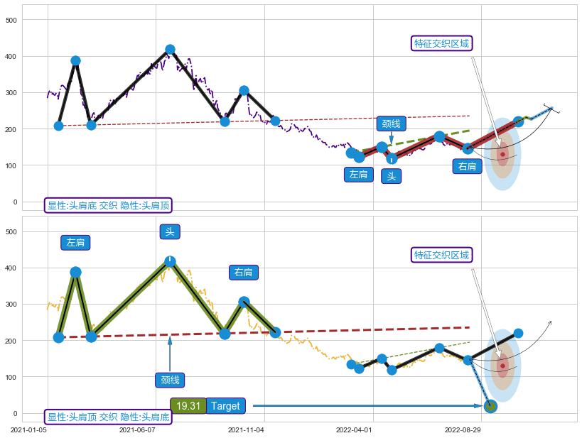 ➢ 头肩顶:猜想预期下跌目标target即将达成,随后猜想强支撑来临,预期反弹上涨(均值回复)