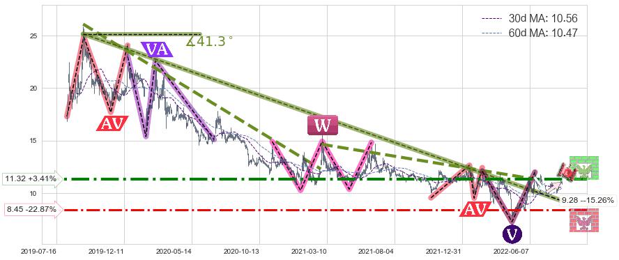➢ 【仅预测突破】最后价格:10.95与预测突破价格:11.80→【空间中等】后续最小【反转】第一目标价格→(2022-10-14: 15.25 )
