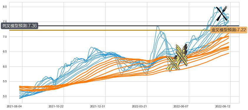 ➢ 21小时均线于(2022-08-01: 7.76)形成【死叉】基于【死叉历史模型】预测死叉后最低波谷价格: 7.36, 死叉后最低价格7.21,已经下跌超出预测最低波谷价格, 预期反弹