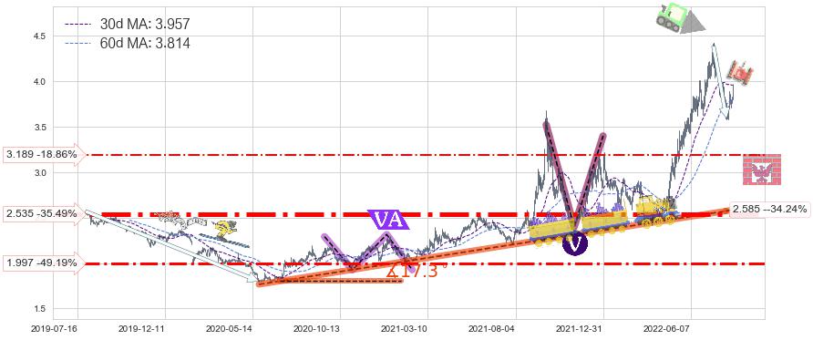 ♘ 支撑价格位2.535,可信任强度90.28%,距离最后交易2022-08-12形成的收盘价格3.930相差 -35.49%