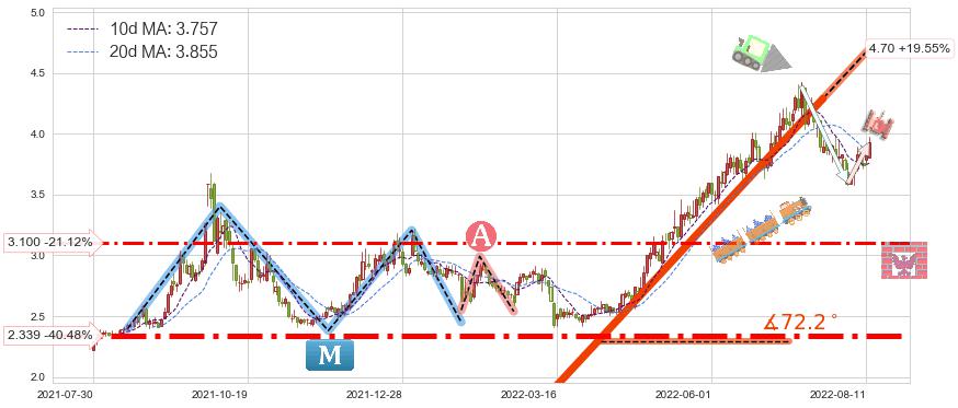 ♘ 支撑价格位3.100,可信任强度55.79%,距离最后交易2022-08-12形成的收盘价格3.930相差 -21.12%