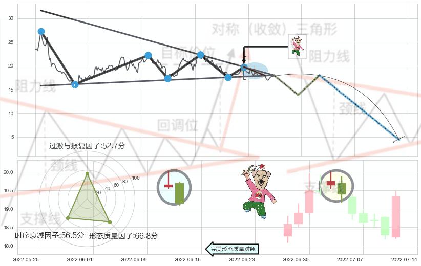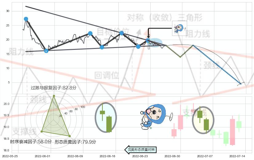 ➢ 射击之星形态 🔜 下降对称三角整理支撑破位转换阻力下跌 综合量化分数:37.94 【偏空】