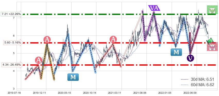 ♘ 支撑价格位4.34,可信任强度99.00%,距离最后交易2022-08-12形成的收盘价格5.90相差 -26.49%