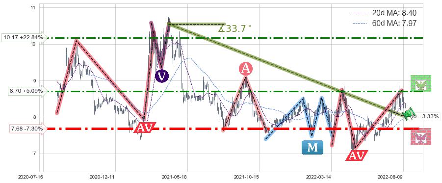 ♘ 阻力价格位8.70,可信任强度62.79%,距离最后交易2022-08-12形成的收盘价格8.28相差 +5.09%