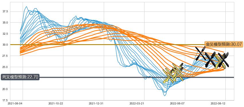 ➣ 55小时均线于(2022-08-11: 26.40)形成【死叉】基于【死叉历史模型】预测死叉后最低波谷价格: 21.49, 死叉后最低价格26.34,尚未达到预测最低波谷价格, 预期继续下跌