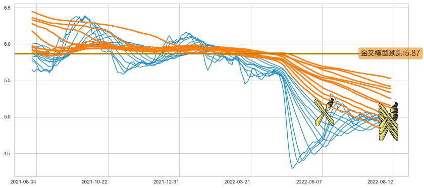 ➣ 90小时均线于(2022-08-10: 4.96)形成【金叉】基于【金叉历史模型】预测金叉后最高波峰价格: 6.26, 金叉后最高价格5.28,尚未达到预测最高波峰价格, 预期继续上涨