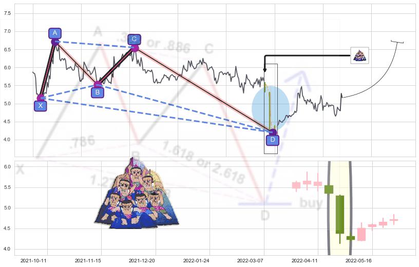 ➢ 谐波蝴蝶:c下跌到达d:猜想拉升 → 上涨 →【拐点】强支撑临近 → 大趋势均值回复