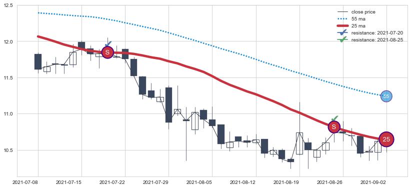 ➣ 25小时均线于(2022-07-08: 10.15)形成【死叉】基于【死叉历史模型】预测死叉后最低波谷价格: 9.30, 死叉后最低价格9.23,虽然已经到达预测最低波谷价格,但耗时间很短动能很强, 预期继续下跌